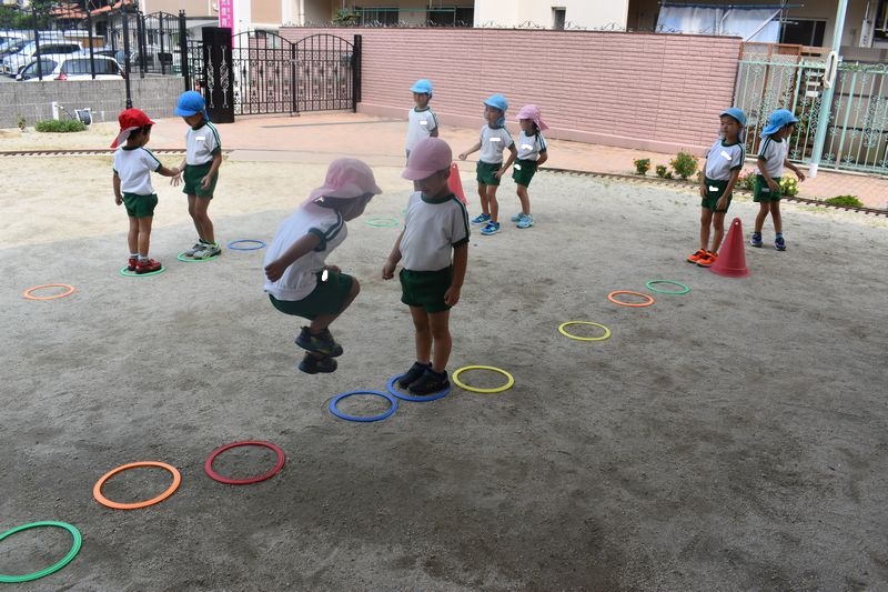 小さなフープを両足ジャンプで進んで中間地点でお友達とジャンケンの勝負!勝った子はそのままで負けた子は次のお友達と交代です。ジャンケンに負けた子は次勝つよと意気込んでます(^^♪