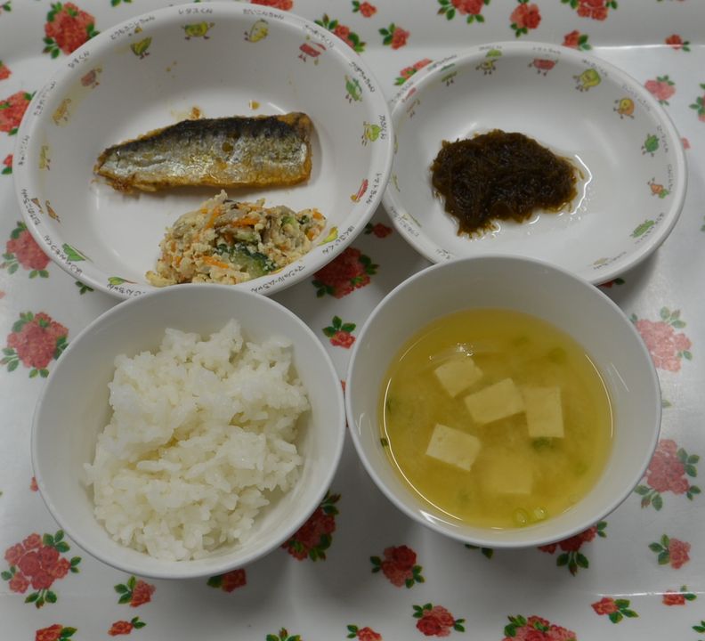 白飯、みそ汁、イワシのかば焼き、白和え、もずく酢