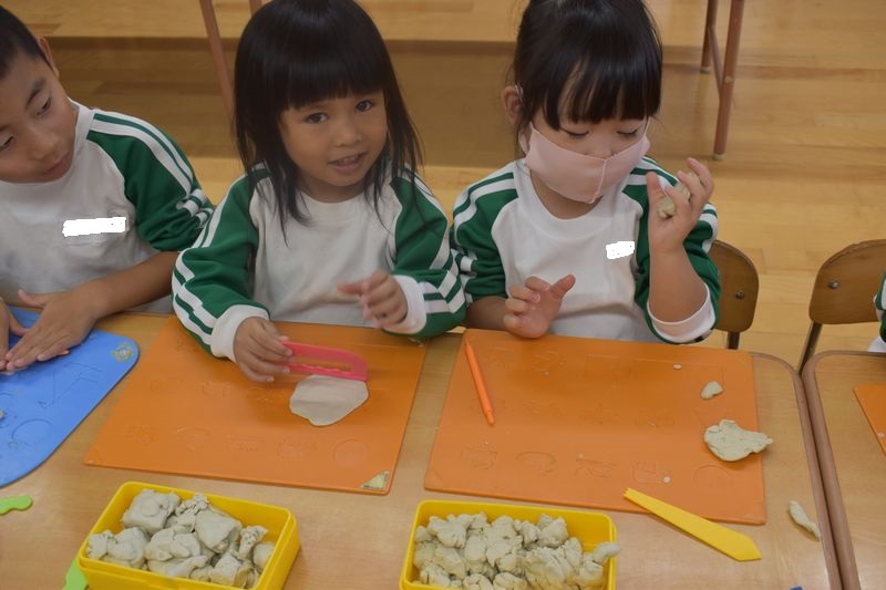 年少さんは製作遊びや粘土遊びをしました(^^♪ 製作ではクレパスで色を塗った後、みのむしの顔を書いて折り紙で洋服を着せました。指先を使った製作や遊びを多く取り入れて日常生活の中で箸や鉛筆を器用に使えるようにしています!!
