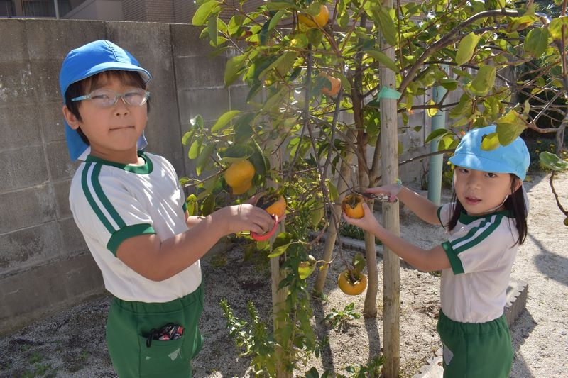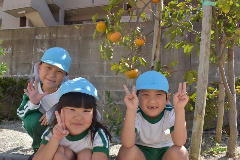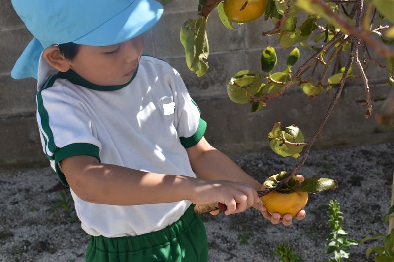 園庭の柿の木に柿実り、オレンジに色づきました。、大きなハサミでチョンキン!柿の収穫!!給食やおやつで出てくるのが楽しみです!(^^)!