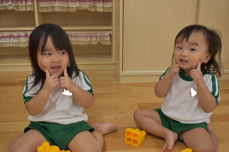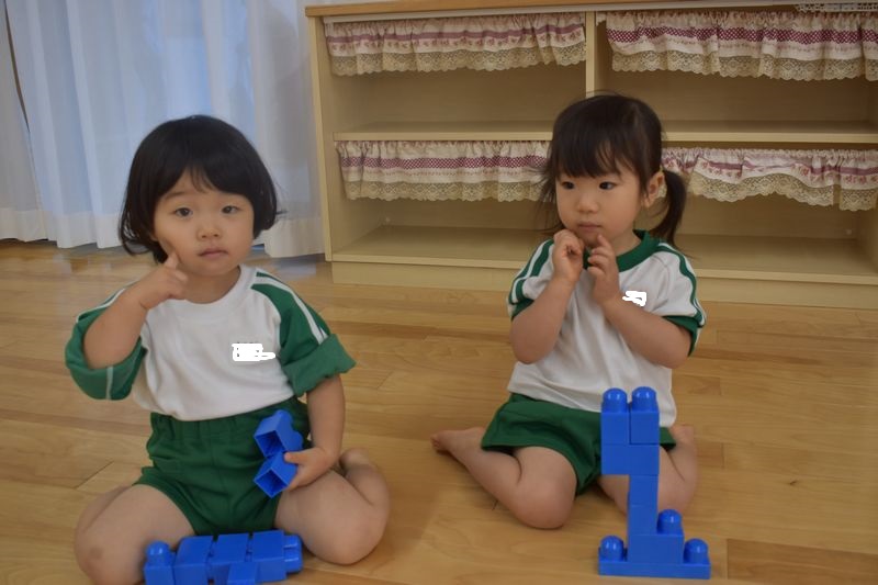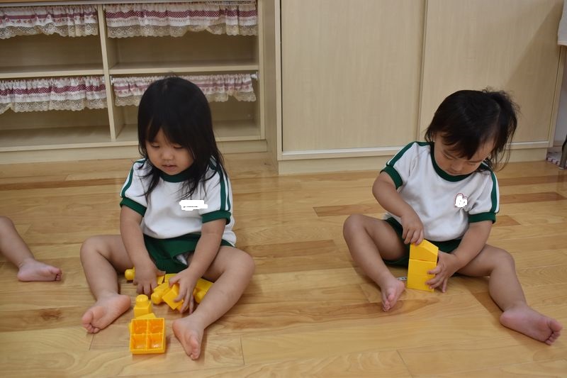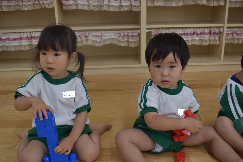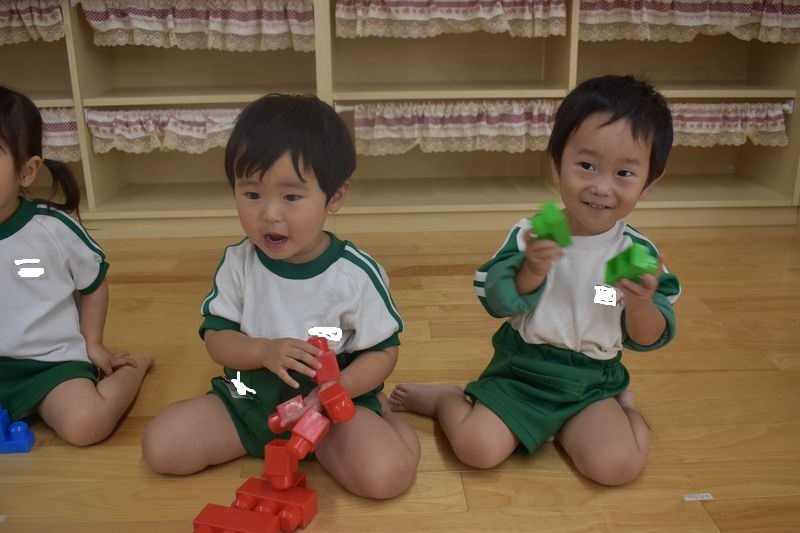 ブロックを組み合わせたり、指にはめたり、メロンパン屋さんの歌を歌ったりと思い思いに楽しんでいる子ども達です(*'▽')