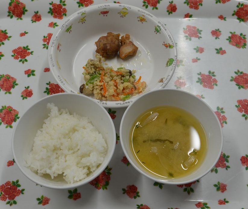 白飯、みそ汁、鶏の甘辛煮、うの花の炒り煮
