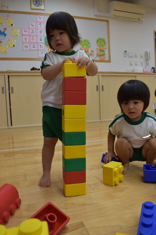 雨の為、大型ブロックをして過ごしました(^_-)-☆お友達と積み重ねてみたり、ブランコを作ったり赤ちゃんに見立ててお世話をしたりとそれぞれが楽しく過ごしました☔