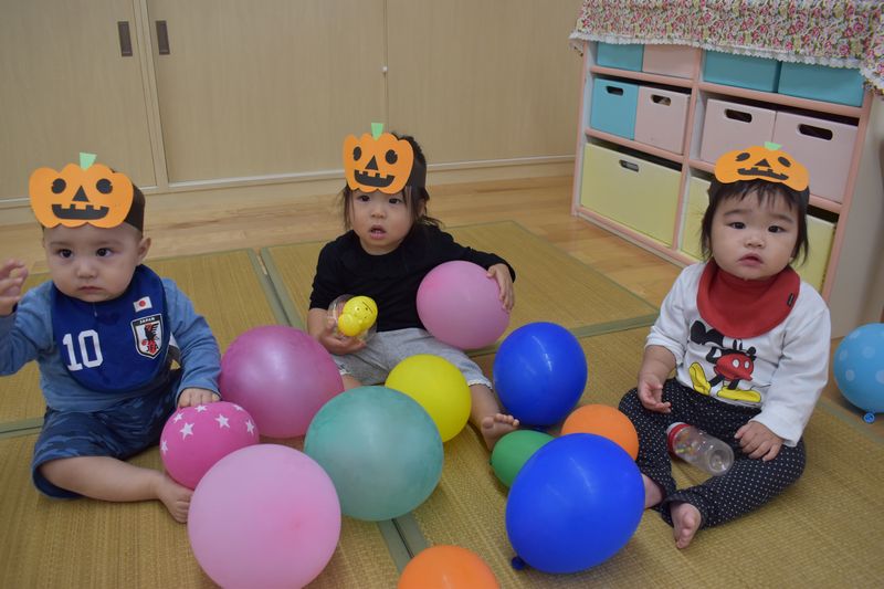 今日はハロウィンなのでみんなでジャック・オー・ランタンのお面を作りました (^^♪ 目や口を貼って楽しみました。