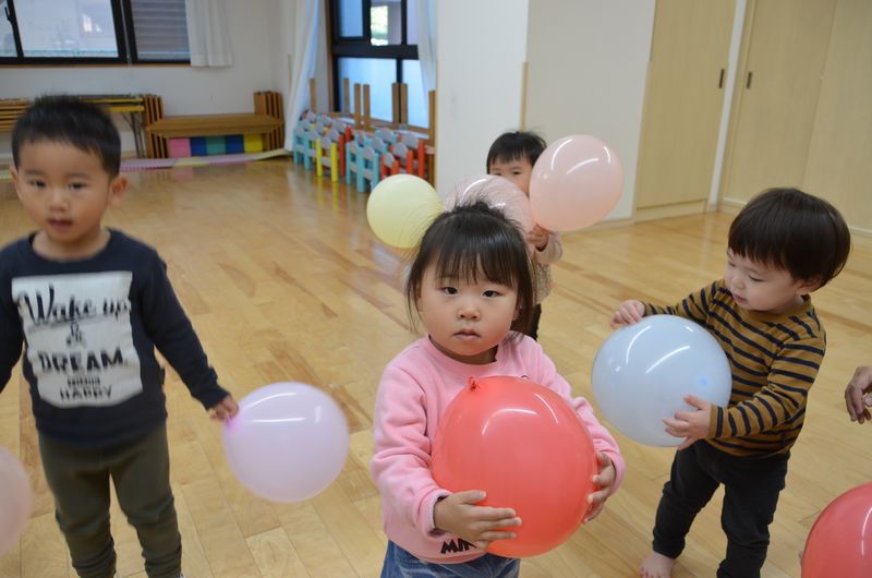 ふうせんあそびを楽しむすみれ組。ふわふわ動くふうせんを追いかけたり高く上げてキャッチしたり皆で楽しく遊んでいます!