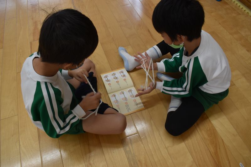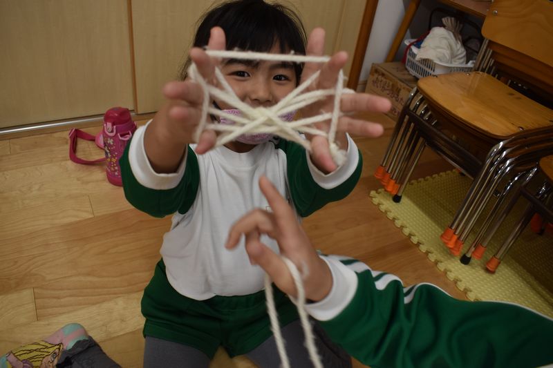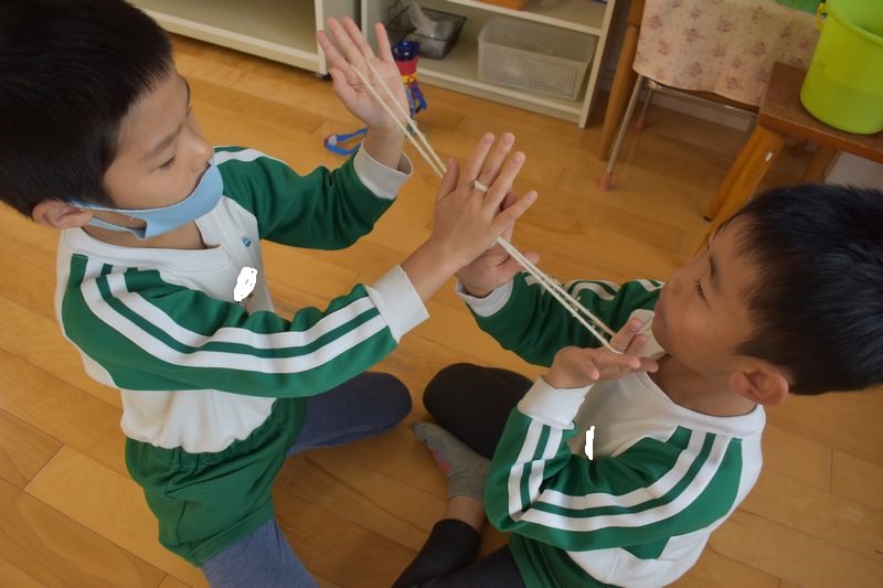 指先を器用に動かしあやとり遊びが大好きな子供たち一人あやとりでは箒や蝶などを作ったり二人あやとりではおもちつきでぺったん!ぺったん!と楽しんでいます!!