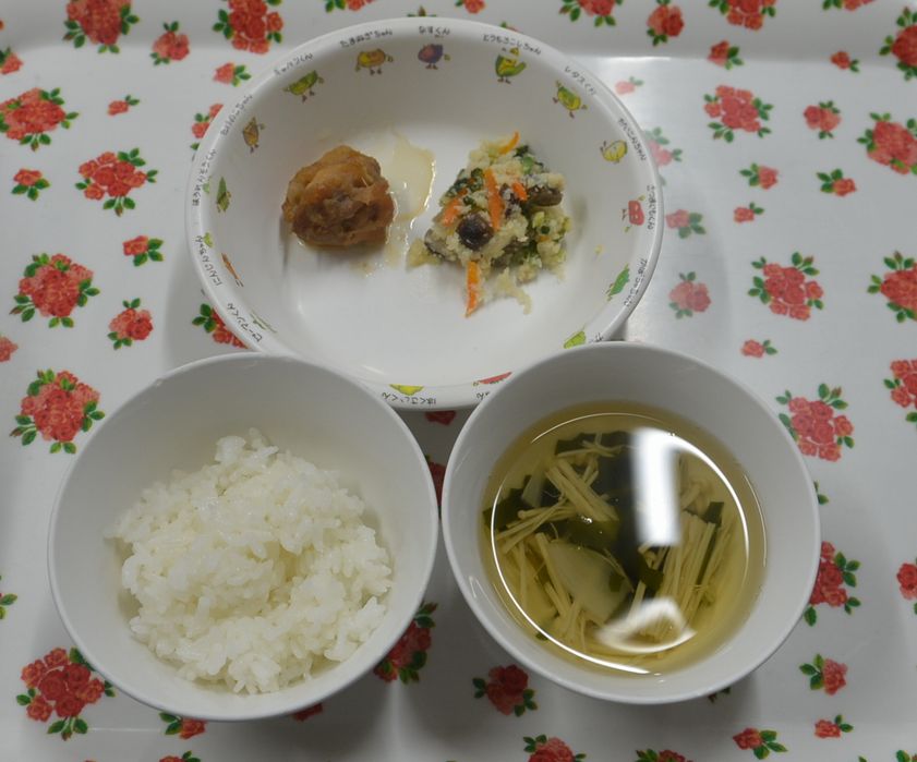 白飯、清汁、鶏の甘辛煮、うの花の炒り煮