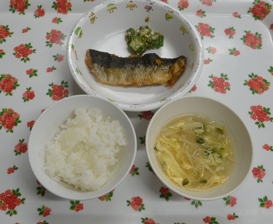 白飯、かきたま汁、イワシのかば焼き、オクラ和え