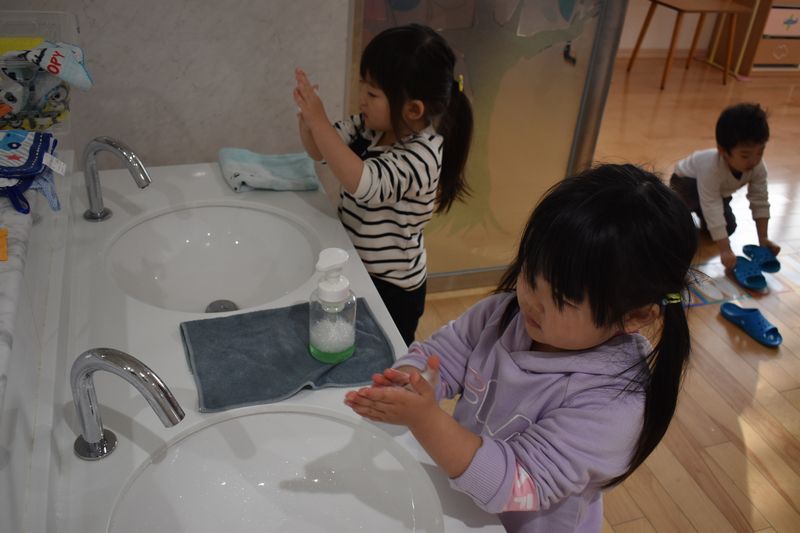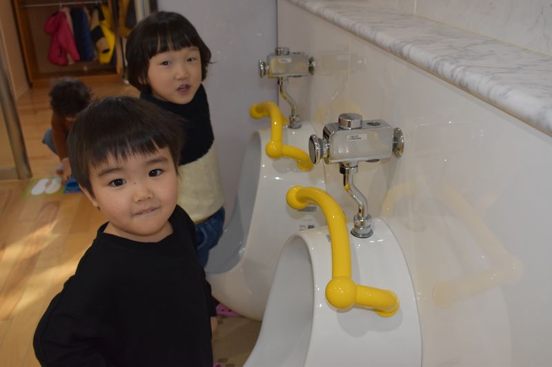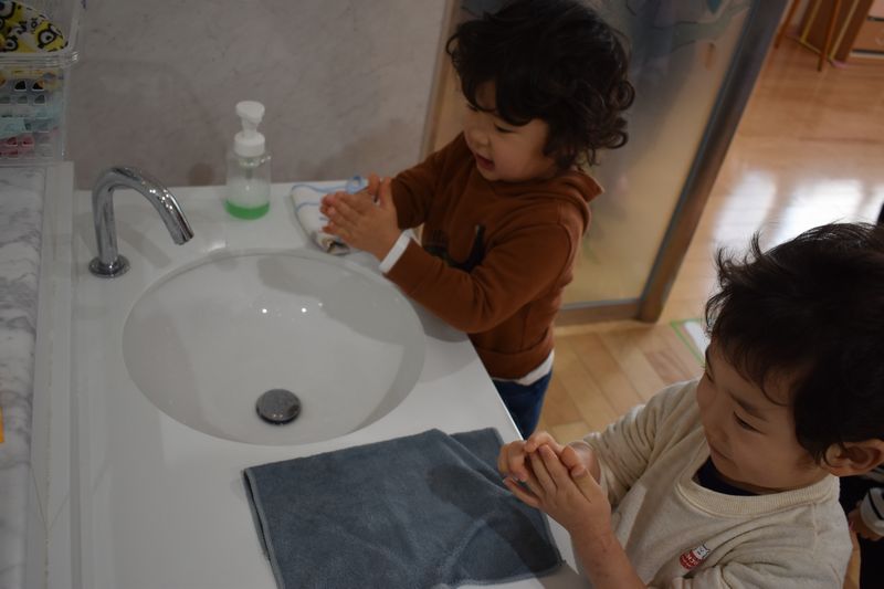 2歳児さんは4月から2階の教室に行きます!なので、2階の以上児クラスへの準備として2階のトイレや洗面台を使う練習を少しずつ始めています。みんなお兄さんお姉さん気分で楽しく練習しています(^_-)-☆