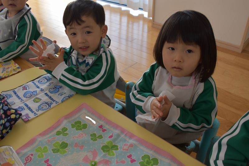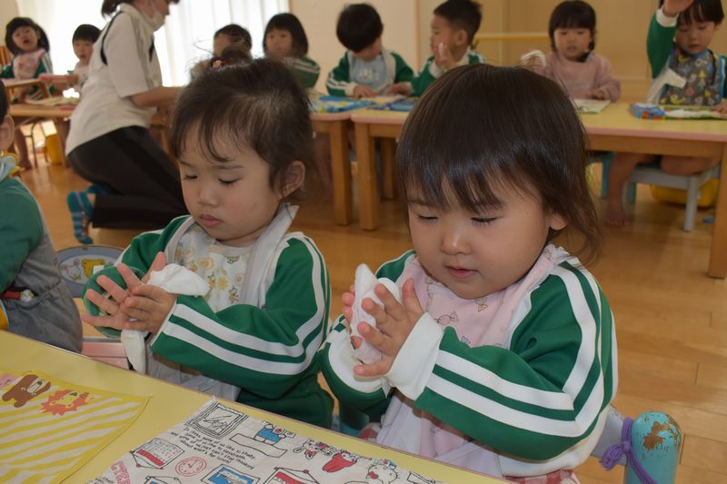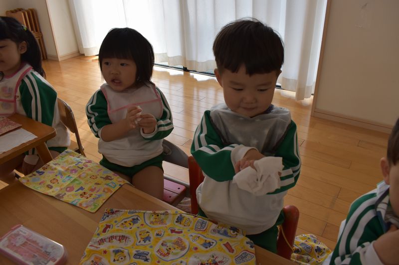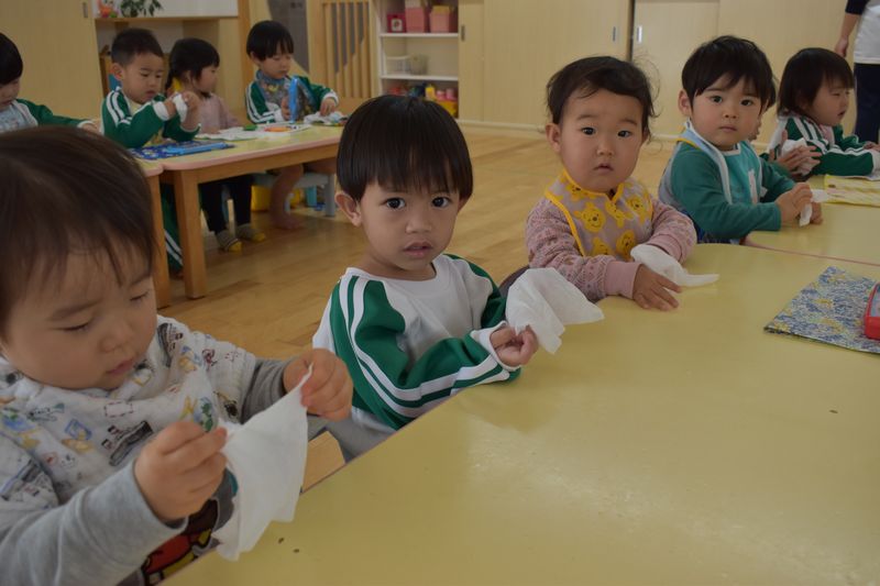 除菌おしぼりが大活躍中です!おやつの前・ご飯の前と食べた後に口と手を拭いています。コロナ感染症など菌に対しての対策は徹底しています!