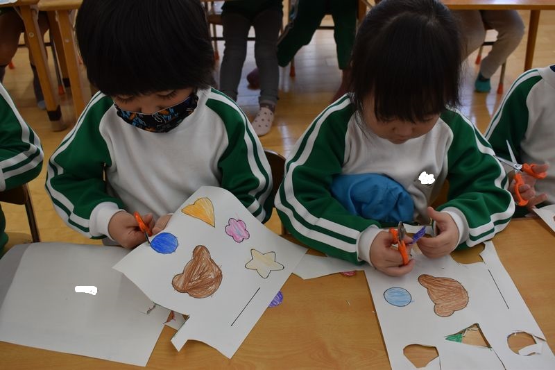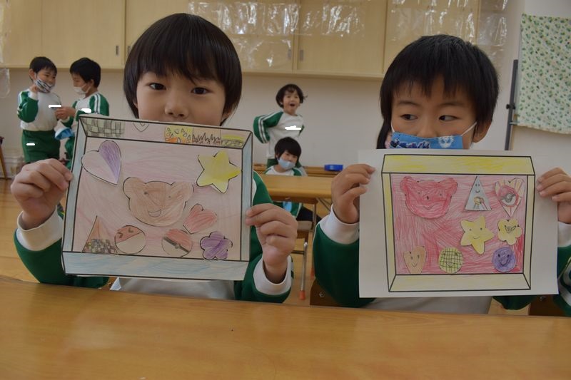 年中さんはバレンタインにちなんで画用紙でお菓子作りをしました(^^♪ 子供たちの個性が光るお菓子箱の感性です!