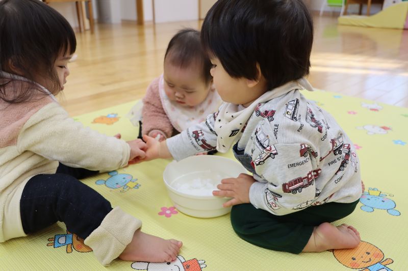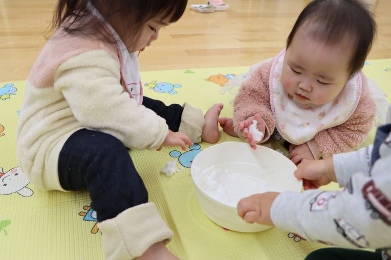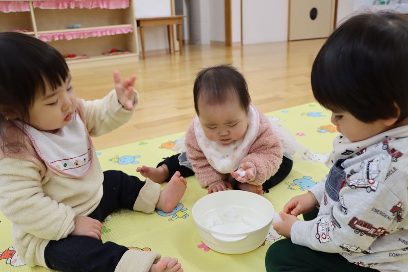 昨日からの雪が朝には一面雪景色になりました!つぼみ組さんは初めての雪なのでテラスに積もった雪を容器に入れて見せてみました(^_-)-☆ はじめは何だろうといった感じで見てるだけでしたが触ってみせると恐る恐る触ってツンツンとしたり慣れてくるとギュッと握ってみたりお友だちに「はい。」と渡したてみたりと冷たい感触を楽しんでました(*^-^*)