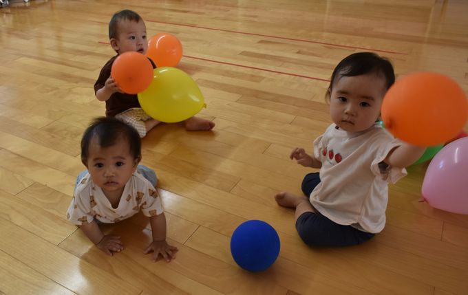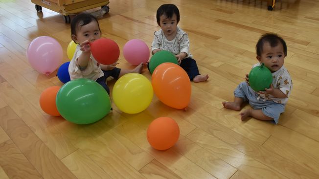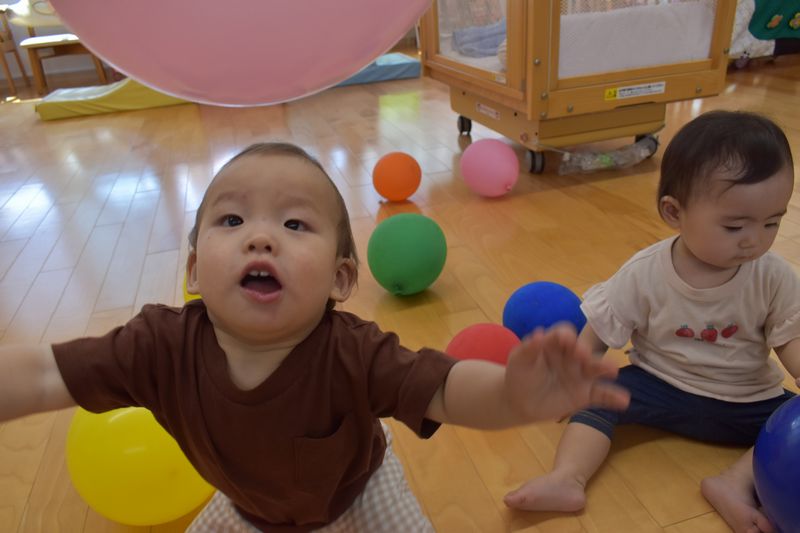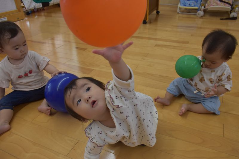 風船が大好きなつぼみ組さん!風船をムニュムニュと押して感触を楽しんだり、ポンと上にあげてあげたら風船を掴もうと両手を挙げてキャッチしようとします。結び目を持ってブンブンと振り回したりいろいろな遊びを見せてくれます。風船を出すと目が輝きちょうだいと寄ってきます。つかむのも上手になってきたり歩き出したりとつぼみ組さんは日々の成長がすごいです!(^^)!