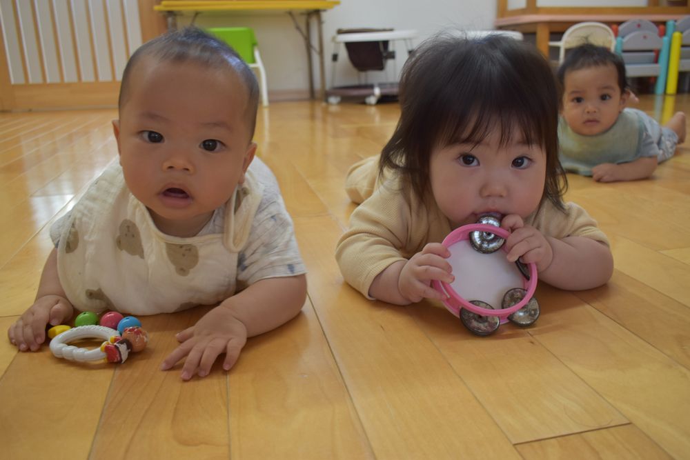 つぼみ組さんは音が鳴るおもちゃが大人気です!床に叩いて鳴らしてみたり「プー」とラッパを吹いてみたり音が鳴るとみんな音が鳴る方にぞろぞろと集まって鳴らしあいっこしてます(^o^)丿
