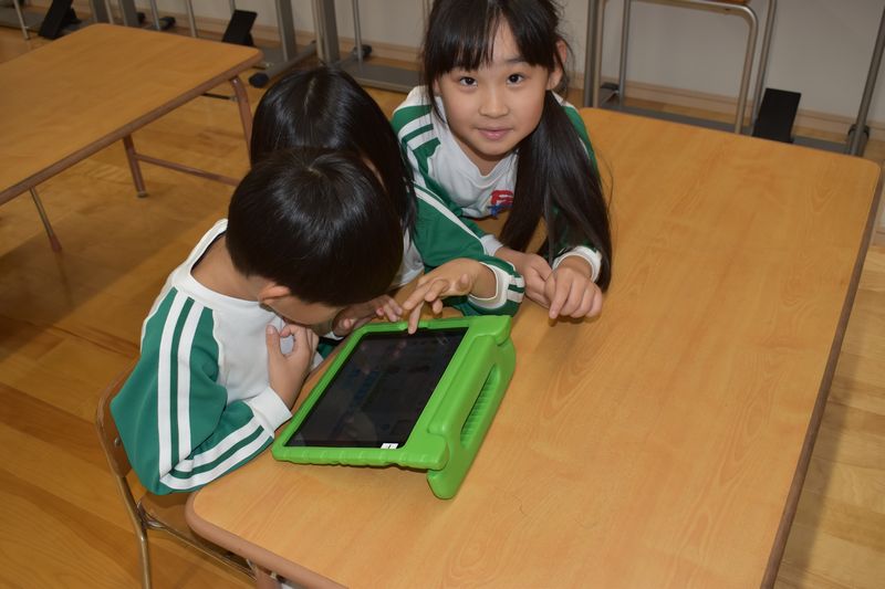 本日はICT教室日です。今日は、タブレットでキャラクターを自分で操作して動かしました。出来たら先生達に「見て!」と自分の作品を自慢しています。子どもたちはこの時間が楽しみで仕方ないようです。