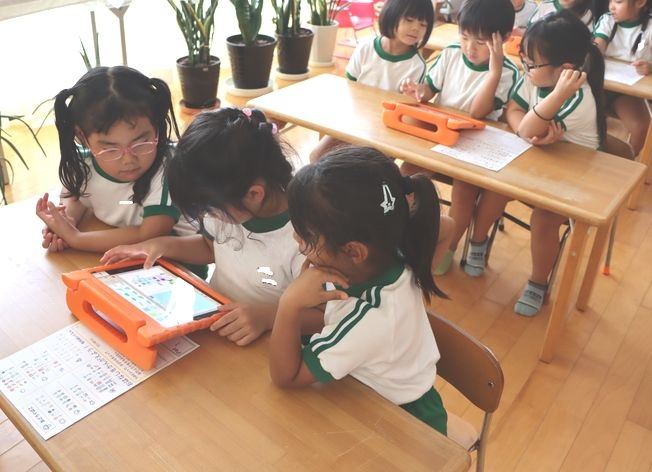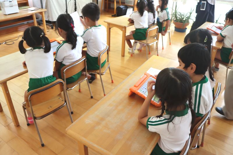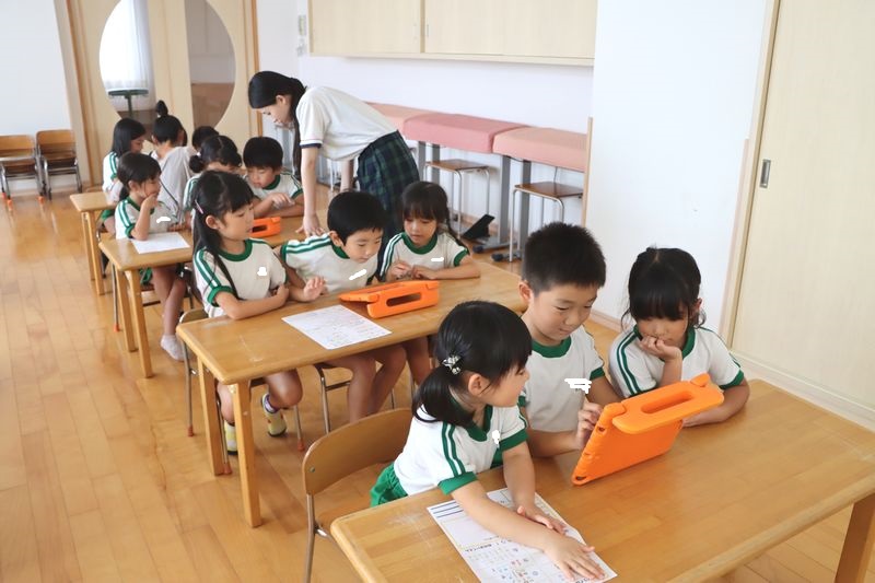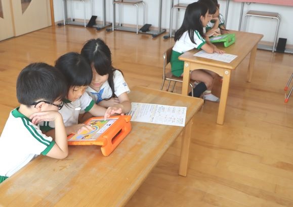 今日はICT教室の日でした(^o^)丿 今は絵本を製作中でどんな背景にするか、キャラクターはどれにするか、どんな物語にするかをグループで相談して作っています。分からないところがあれば手をあげて先生に聞いて表情は真剣そのもの壮大な物語が出来ています。言葉も吹き出しで入れたりでみてて表現のすごさに圧倒されます(*^-^*)どんな物語が出来るか発表会が楽しみです!