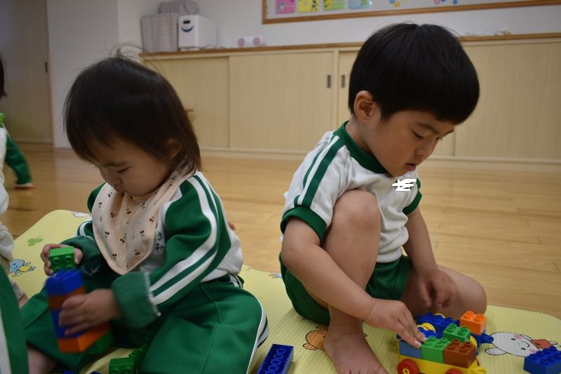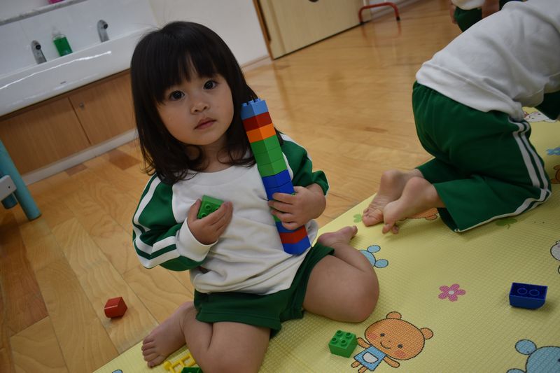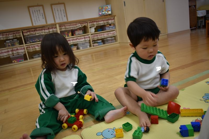 今日は雨なのでお部屋で楽しく過ごしました!ブロック遊びをしましたが最近ではお友達との貸し借りができるようになり「貸して!」「どうぞ!」と言う会話が聞こえてきます。みんなで仲良くブロックをするたんぽぽ組さんです(^^♪
