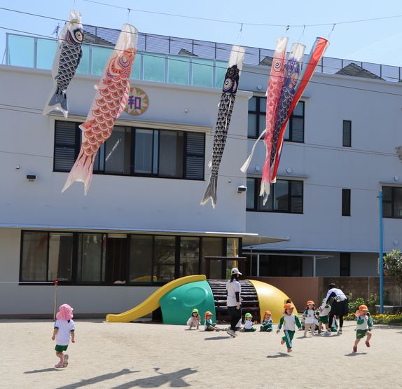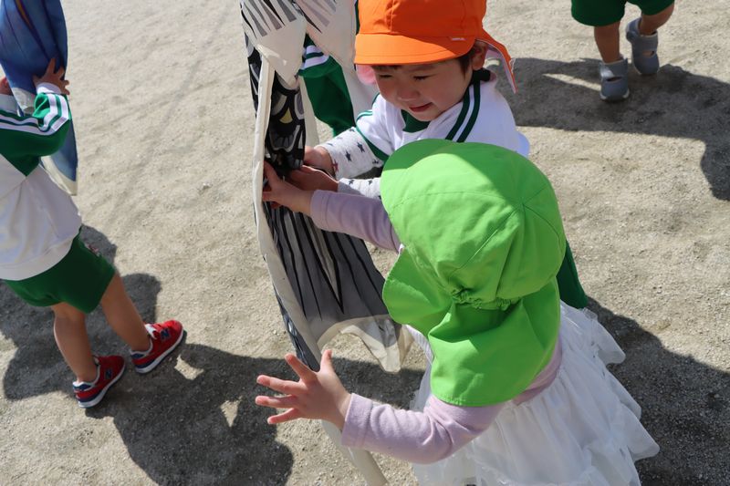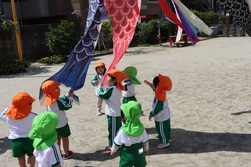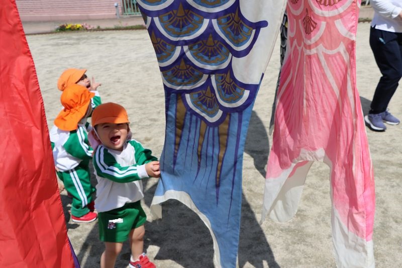 今日はとても良い天気なのでお外に出て元気いっぱい遊びました。園庭にこいのぼりが出たのでみんなで触ってみました。怖がる子や引っ張ってみる子やこいのぼりでかくれんぼをする子などそれぞれ楽しみました。良い天気が続くといいな(*^-^*)