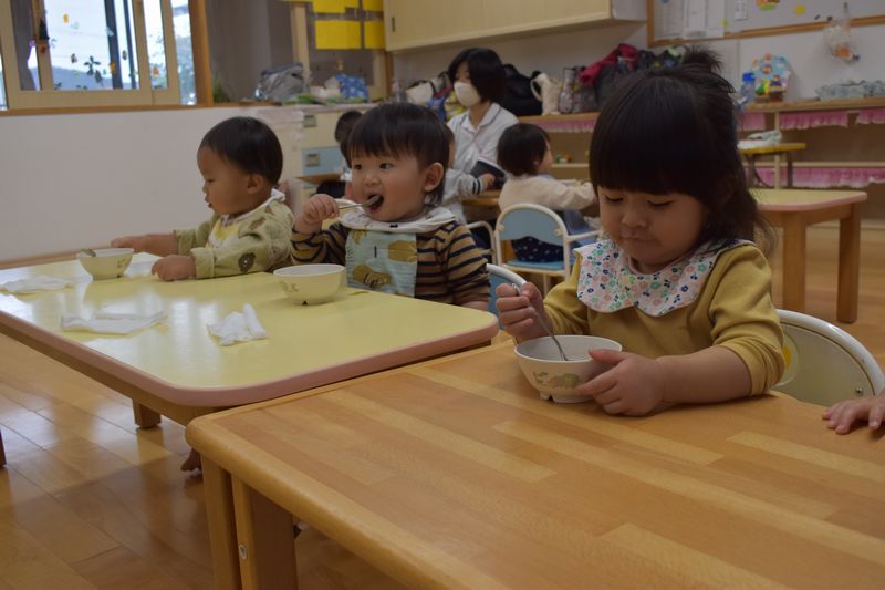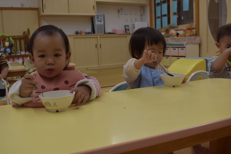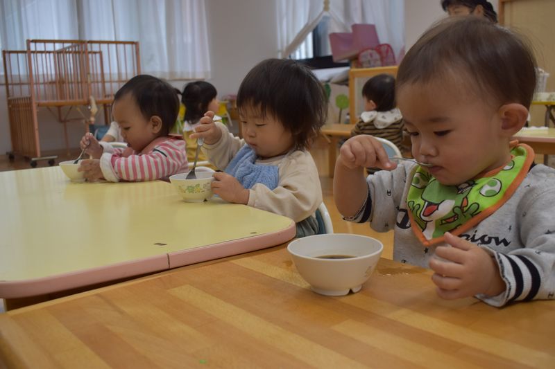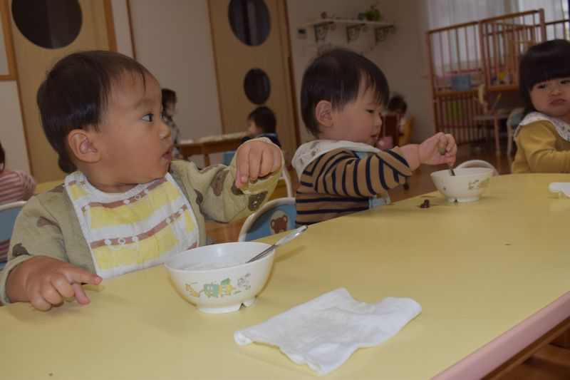 今日のおやつはぜんざい!スプーン使いが上手になってきたつぼみくみさんはスプーンでチャレンジ!!上手にスプーンに乗せて食べれました(^^♪出来なかったことが出来るようになったり成長がすごいつぼみくみさんです(^_-)-☆