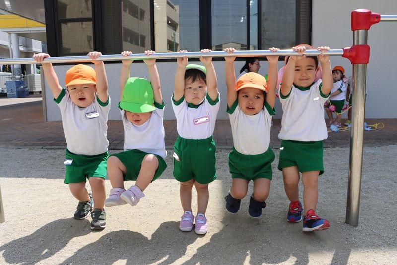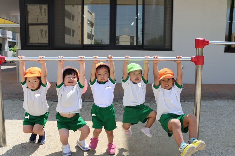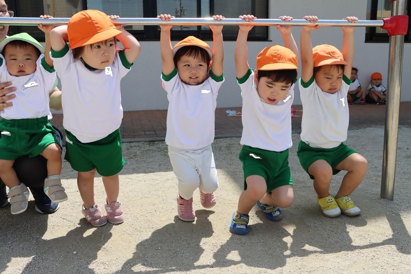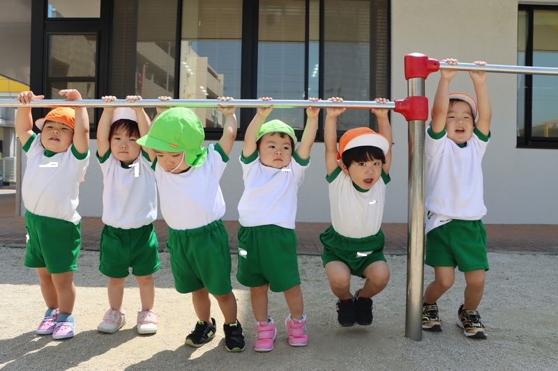 仲良く鉄棒で遊ぶもみじくみさんです!腕の力もついてきて長い時間ぶら下がることが出来るようになりました!ぶら下がるときに「ぶら~ん!!」と言うのが今のブームでみんなで仲良く「ぶら~ん!」と言ってぶら下がってます (^^)/ みんなすくすく成長しています!