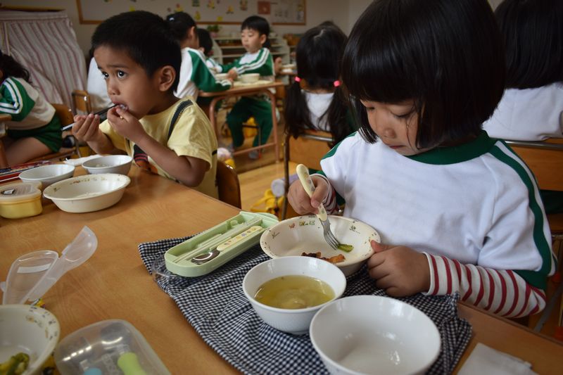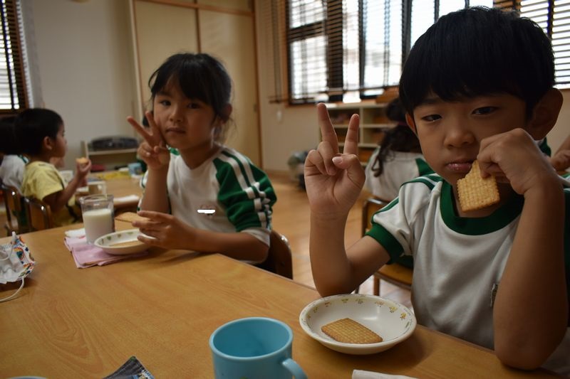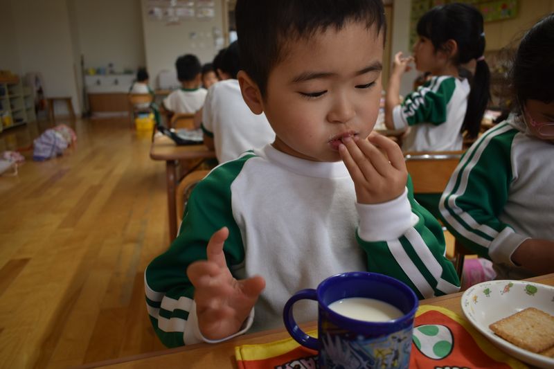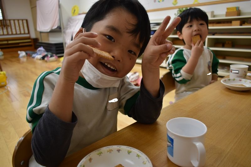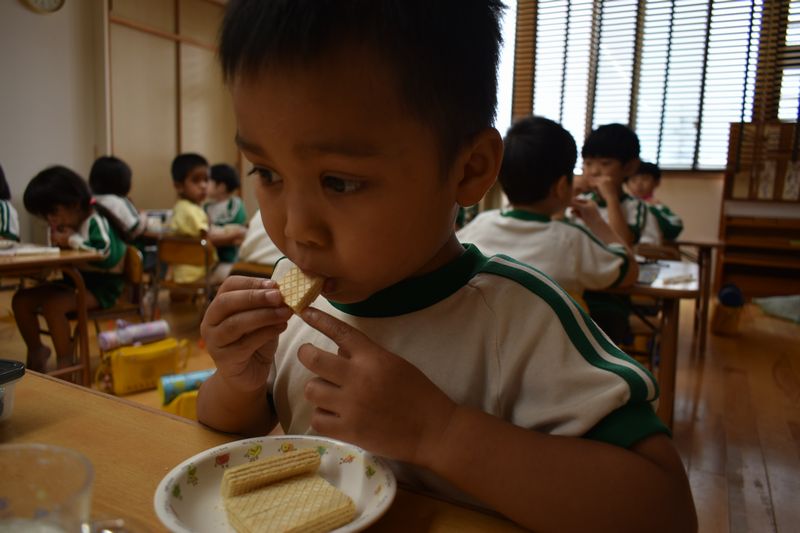 みんなで仲良く給食やおやつを食べています!苦手なものは少しだけ減らして一生懸命に食べ進めます(^^)/ キレイに食べ終わると「先生!食べたよ!」と知らせてくれます。頑張って食べ終わったらハイタッチをして喜びを共有しています(^^♪