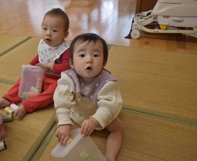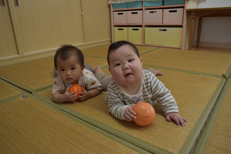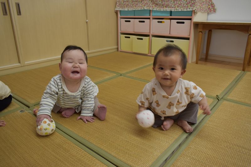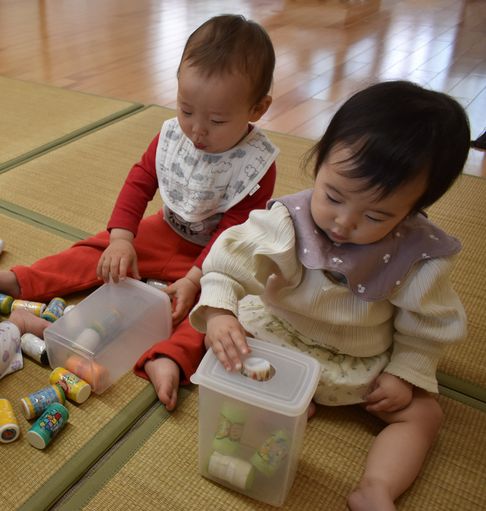 今日はポットン落としとボール遊びをしたつぼみ組さんです。高月齢のお友達は小さな穴へ上手にポットンを落とせるようになりました。全部入れたら「はいっ!」とたくさん入った入れ物を渡してくれてまた入れたいとアピールしてきます((*'▽')ポットン!と入る音にとても楽しそうです(^^♪低月齢のお友達はボールを上手につかめるようになりました。みんな指先が器用になってきています(*^-^*)