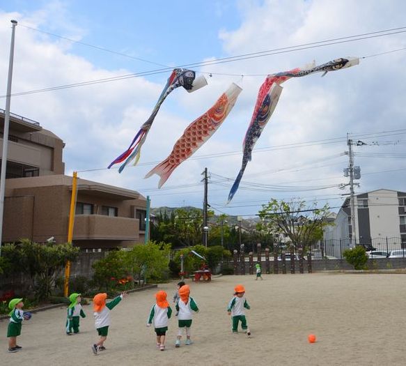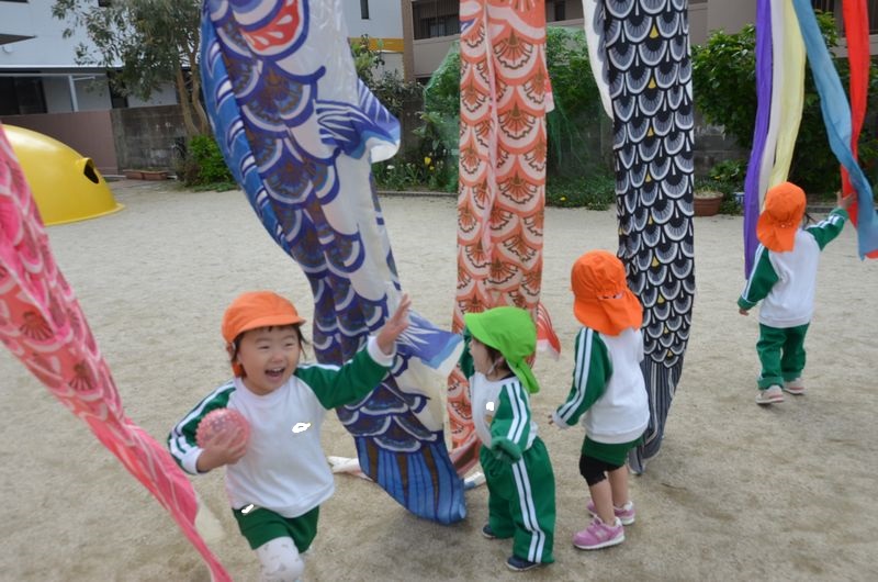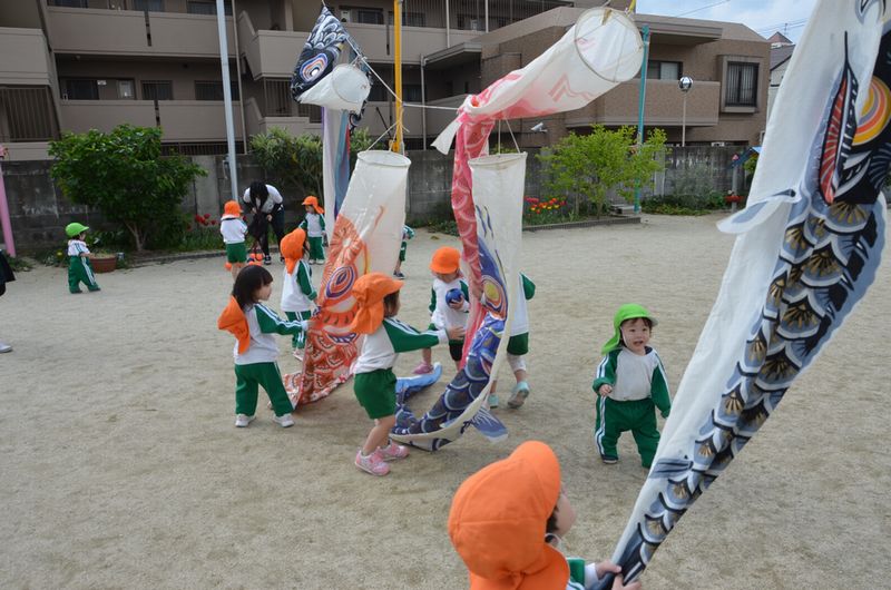 園庭にこいのぼりが上がりました!突然現れた大きなお魚にみんな大興奮(*'▽')ジャンプしたり手を振ったりするので手の触れる高さまで降ろしたら大喜びで抱きつく子、引っ張る子と興味津々でいろいろな反応を見せてくれたもみじ組さんでした。
