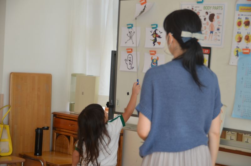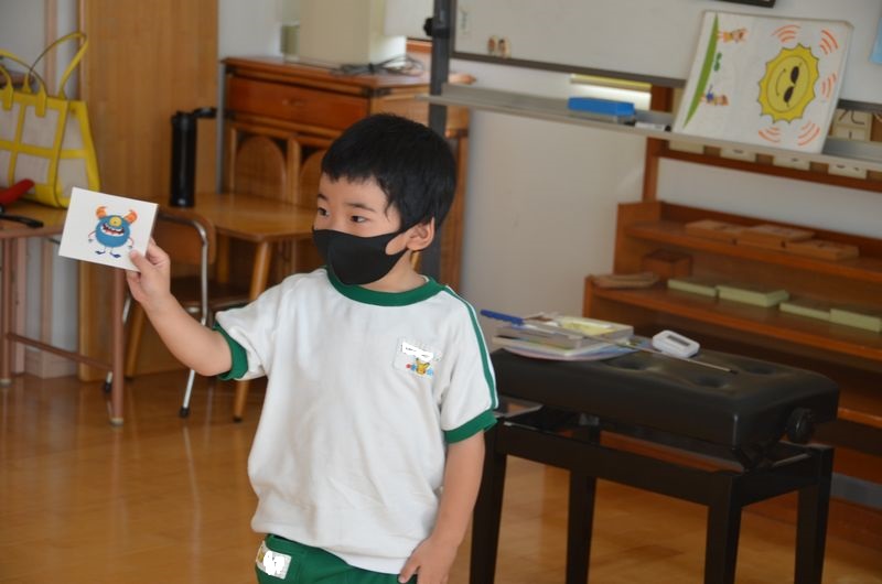 今月の英会話教室はハロウィンです。イラストカードでゲームをしながら楽しく英会話を覚えています(^_-)-☆