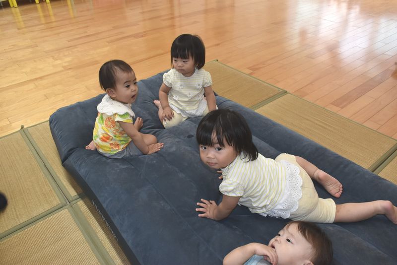 エアマットに乗って遊んでいるつぼみ組さん!お友だちが動いたり先生が押したりしたらゆらゆら~とマットが動くので転がらないようにうまくバランスをとる子一緒になって動いて楽しむ子などそれぞれ楽しく遊びました(^o^)丿